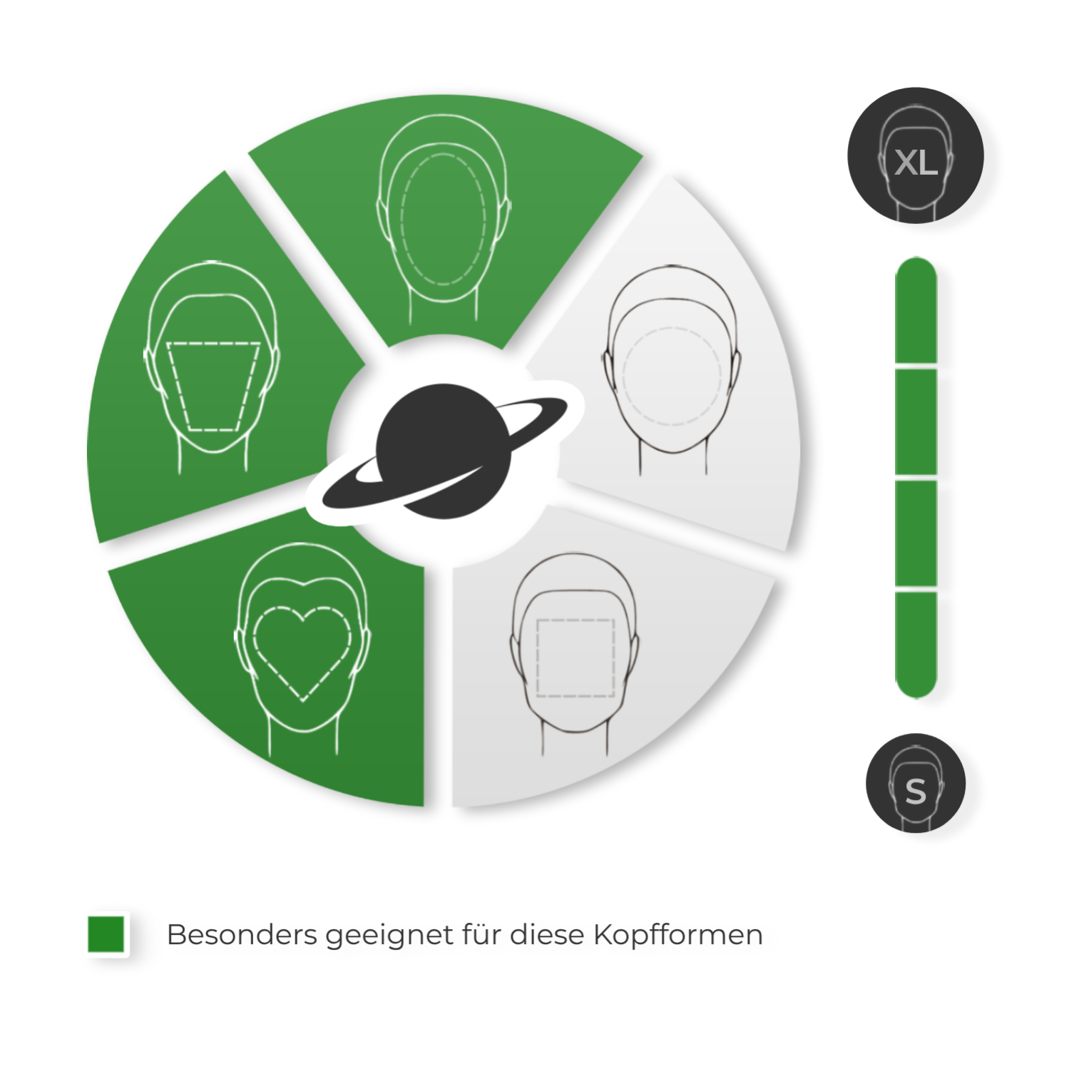 Diese Brille ist für viele Kopfformen oval, viereckig, trapezförmig sehr gut geeignet. Das beste Tragegefühl besteht für kleine bis mittel-große Köpfe.