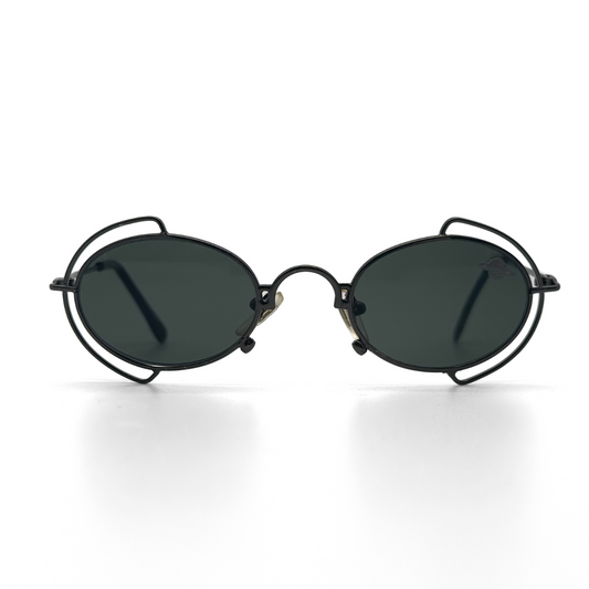 Avantgardistische Sonnenbrille mit smaragdgrüner Tönung und futuristischer Kurvenführung. Die monochrome Shield-Optik umhüllt dabei das Gesicht wie flüssiges Glas. Der tiefgrüne Visor-Look trifft auf minimalistische Details im ästhetischen Y2K-Style .